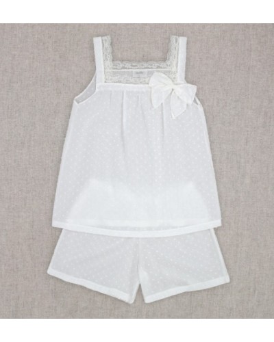 Nuevo Eliminar de lista Lista de deseos Vista rápida Carro Comparar Pijama de comunión plumeti INFANTIL Precio 34,30 € 10 12 14 Pijama de Comunión para niña compuesto por un top de tirantes acabado en puntilla y con un precioso lazo y un short de tejido plumeti