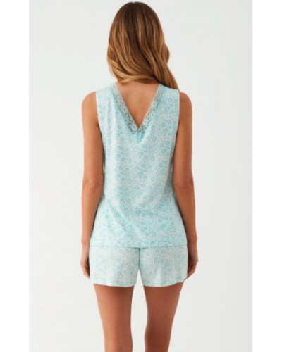 Eliminar de lista Lista de deseos Vista rápida Carro Comparar Pijama verano celeste MUJER Precio 28,00 € M L XXL Pijama de señora con estampado muy discreto, blusa de manga corta y pantalón corto.