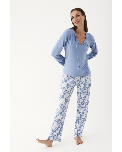 Eliminar de lista Lista de deseos Vista rápida Carro Comparar Pijama fino de señora MUJER Precio 35,70 € M L XL XXL Pijama de manga larga en tejido fino, con pequeño detalle de lazada en el escote y pantalón estampado.