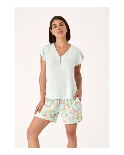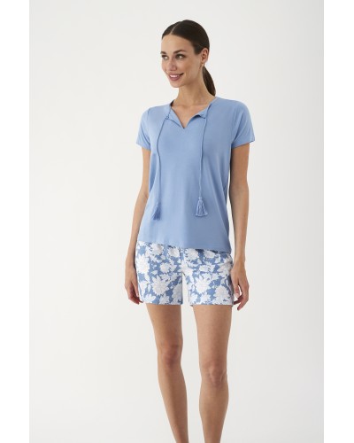 Eliminar de lista Lista de deseos Vista rápida Carro Comparar Pijama verano mujer MUJER Precio 28,10 € M L XL XXL Pijama de verano de mujer con manga corta y pantalón corto, en la blusa lleva un pequeño detalle de lazada.