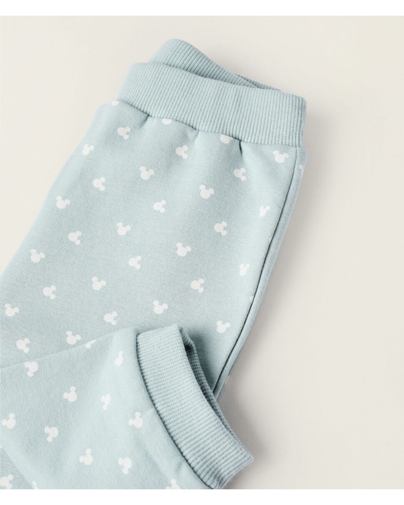 Conjunto de dos piezas para recién nacido, con interior perchado para mayor confort térmico. Incluye una sudadera gris con estampado de Mickey y un pantalón verde agua con patrón de siluetas de Mickey. Extremos acanalados para un ajuste perfecto. Fácil de vestir gracias a los automáticos y a la cintura elástica. Un set perfecto para el día a día. We Care: artículo con certificado Oeko-Tex Standard 100, que garantiza la ausencia de sustancias nocivas o irritantes para la piel.