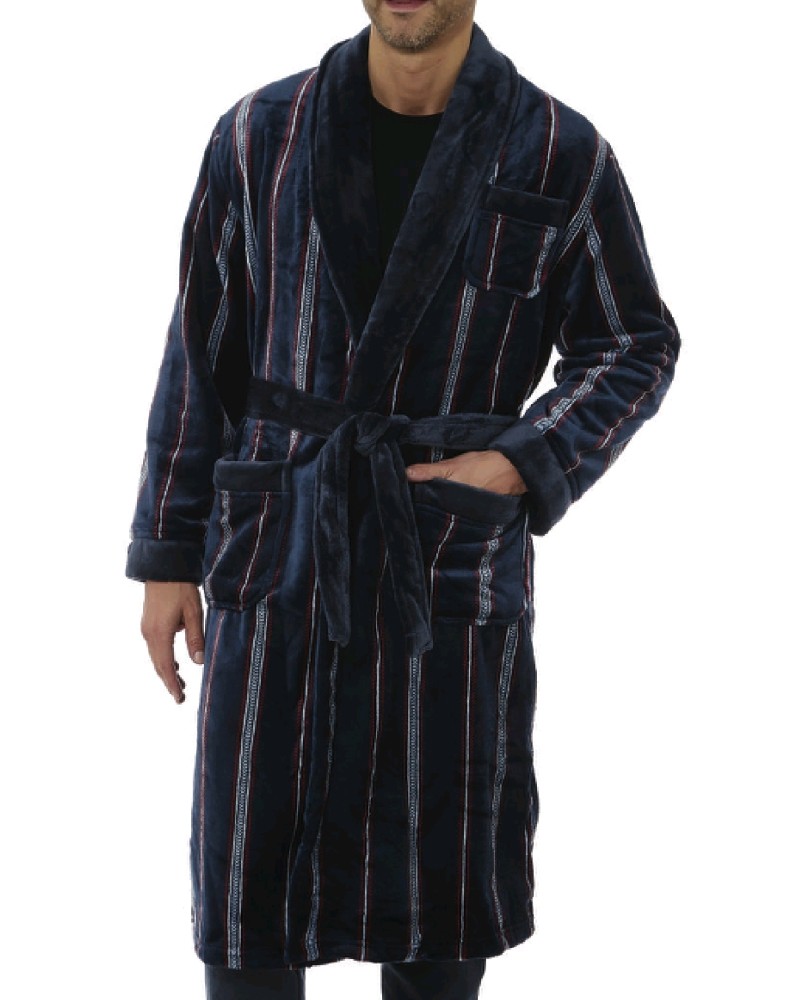 Bata de caballero larga anudada con dos bolsillos y estampado de rayas