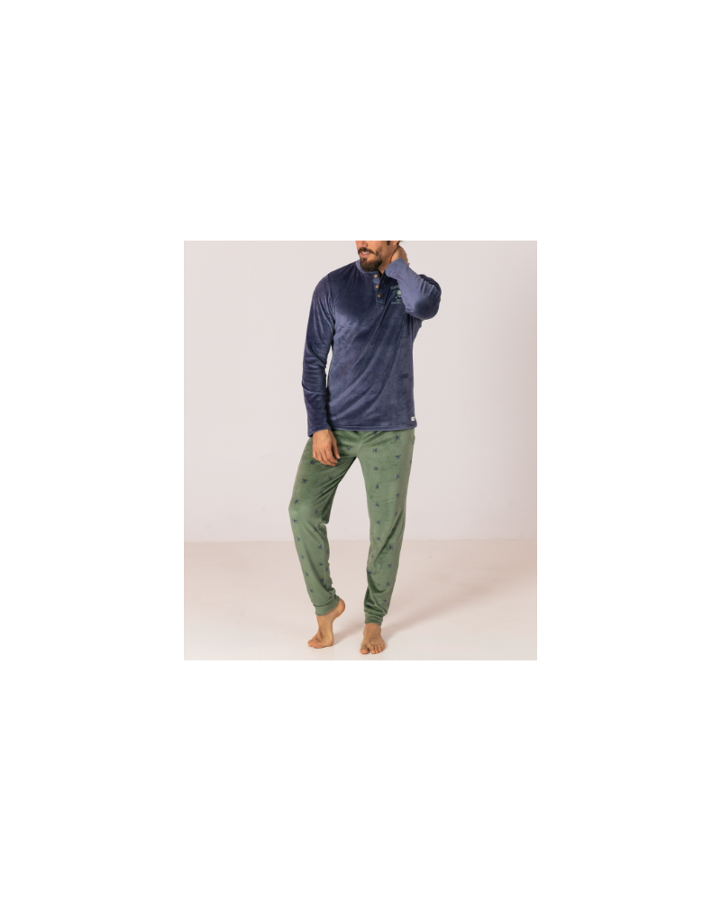 PIJAMA DOS PIEZAS DE TACTO SUAVE. CAMISETA CON FONDO AZUL MARINO, MANGA LARGA, TAPETA Y BOTONES DE MADERA. DELANTERO CON ESTAMPADO POSICIONAL DE CALAVERA.