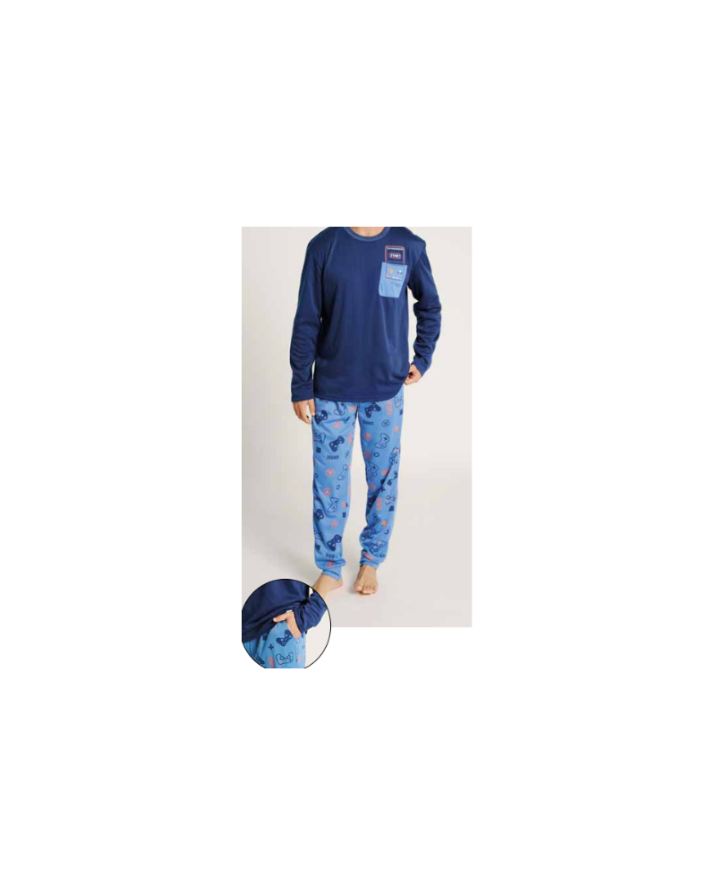 Pijama de punto para caballero con bolsillo en la blusa y en los pantalones, puños en los tobillos y lazada en la cintura. Afelpado interior
