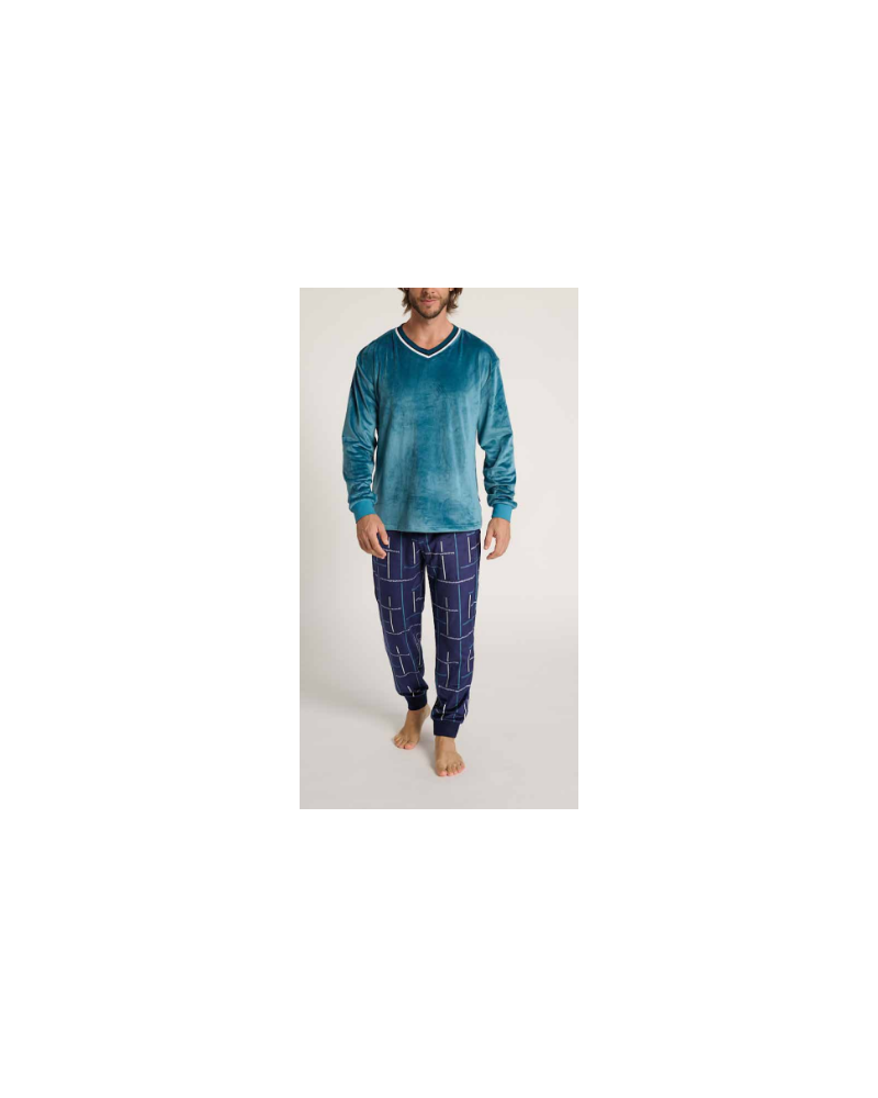 Pijama de coralina con blusa lisa y pantalón estampado , con puños en las muñecas y tobillos.