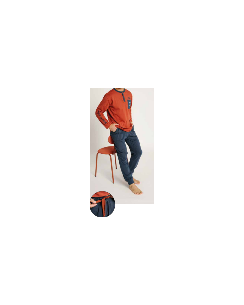 Pijama con bolsillo en la blusa y pequeño detalle de texto, pantalón con bolsillos.