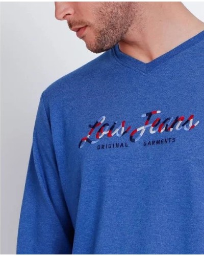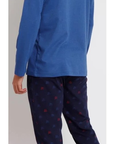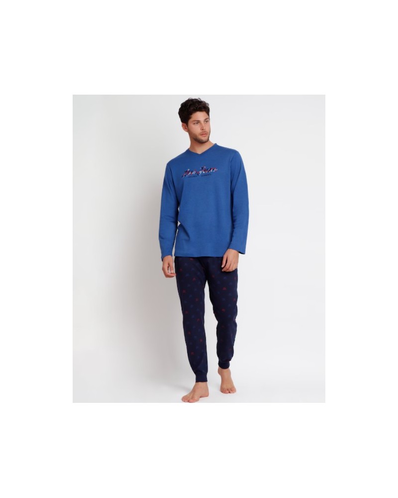 Pijama de punto de algodón, de manga larga, cuello pico y pantalón largo. Camiseta de punto interlock, de color azul, con detalles bordados, personalizada de la marca Lois.