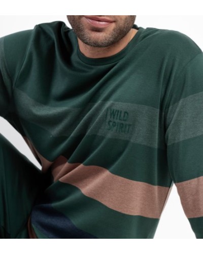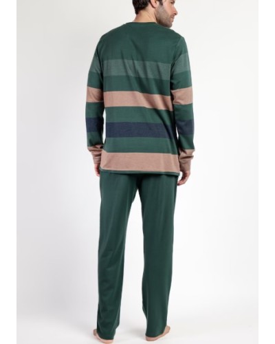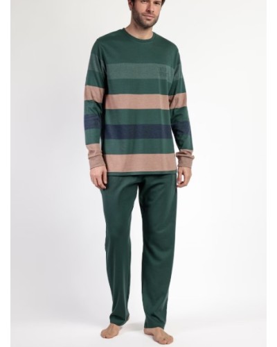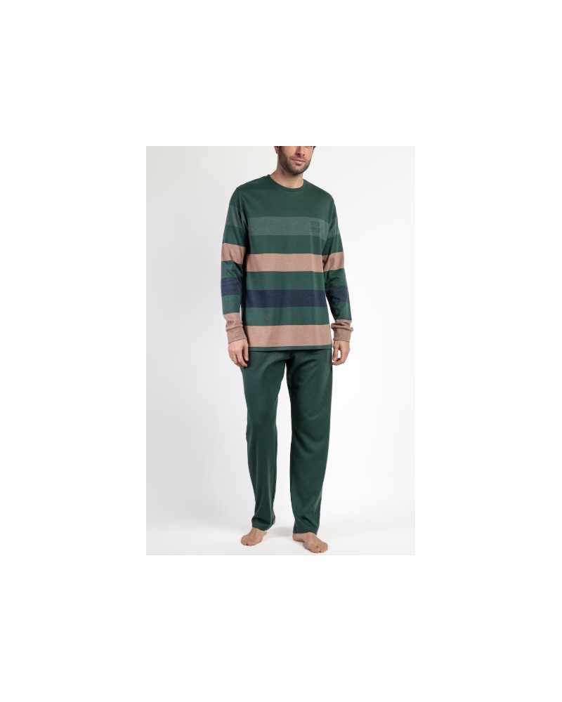 Pijama de punto de algodón, de manga larga, cuello redondo y pantalón largo. Camiseta de punto interlock, en color verde, con detalles en relieve y raya tejida, de diseño personalizado de la marca Admas.