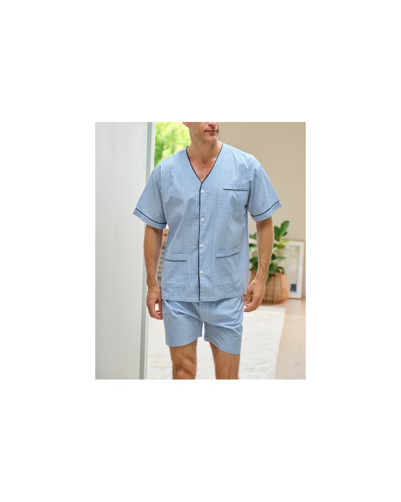 Pijama de popelín con camisa abotonada de manga corta y pantalón corto.