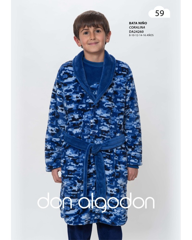 Pijama de coralina con puños en camiseta y pantalón de color azul con el pantalon estampado