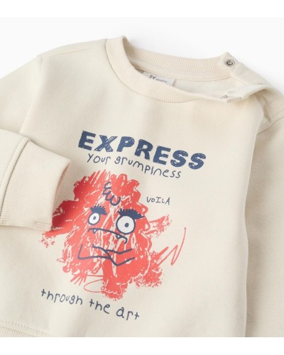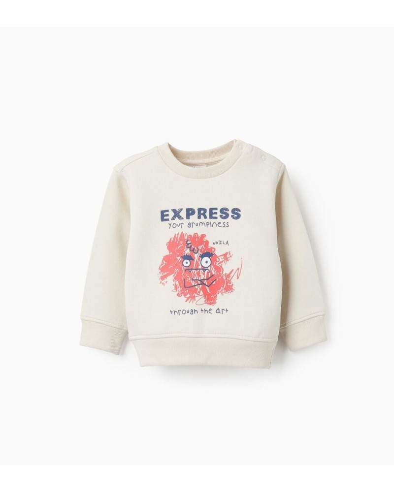 Sudadera beige perchada para bebé niño, en mezcla de algodón. Estampado frontal del tema de los monstruos de las emociones, en este caso específicamente de la Ira. Automáticos en el hombro para vestir fácilmente. Extremos acanalados para un ajuste perfecto