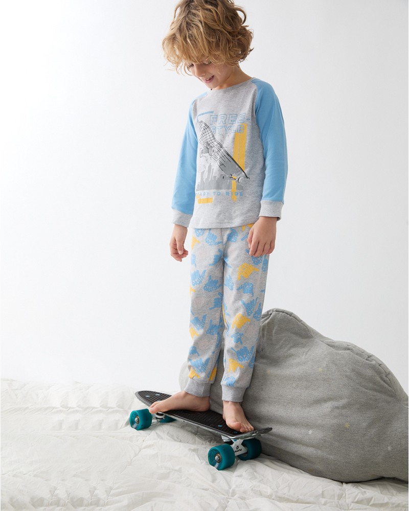 Pijama con estampado en camiseta y pantalones. Con piños en mangas y piernas.