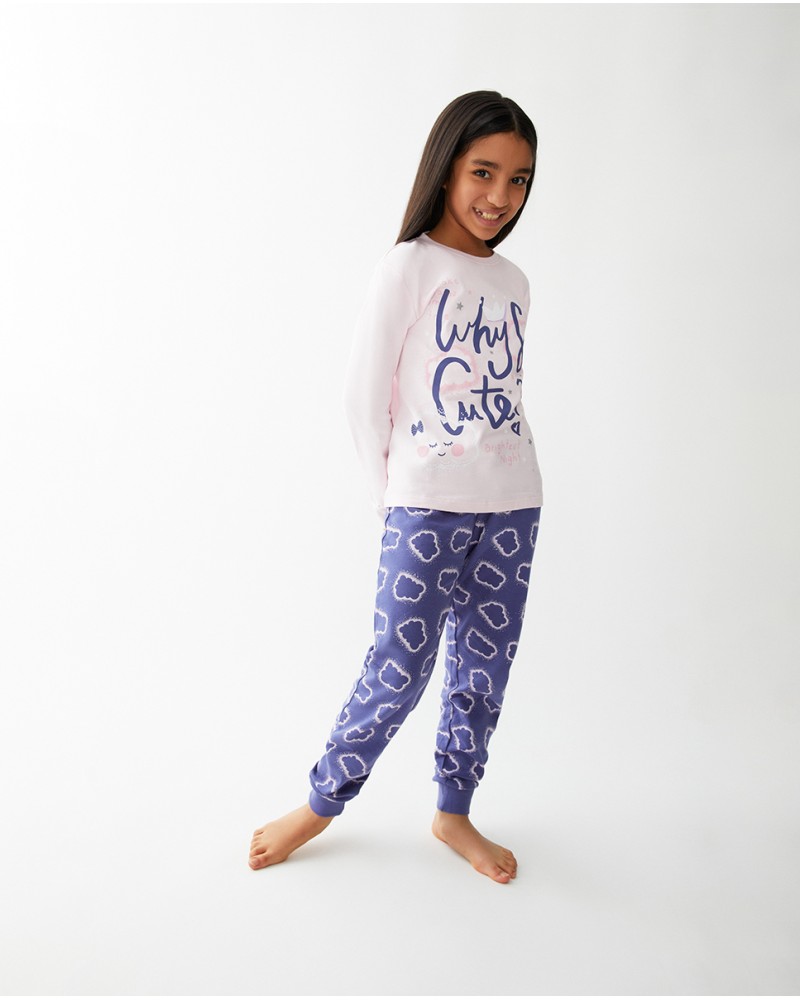 Pijama con dibujo en la camiseta y pantalones estampados. Puños en camiseta y pantalón