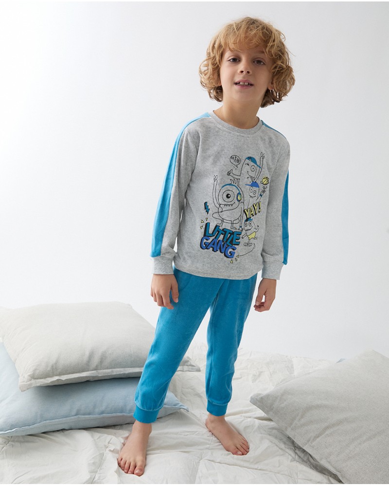 Pijama de terciopelo con dibujo en la camiseta con puños en mangas y piernas.