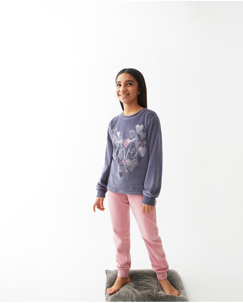 Pijama de terciopelo con camiseta estampada de corazones y puños en mangas y piernas
