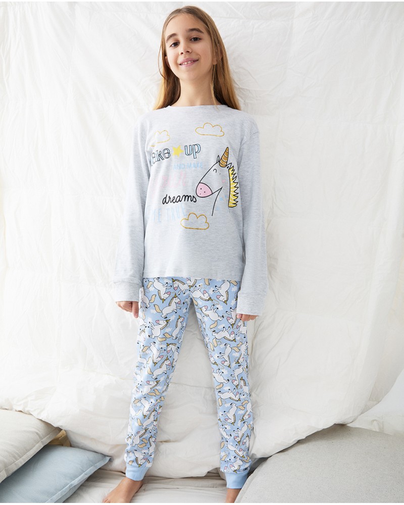 Pijama con dibujo en la camiseta y pantalones estampados. Puños en camiseta y pantalón