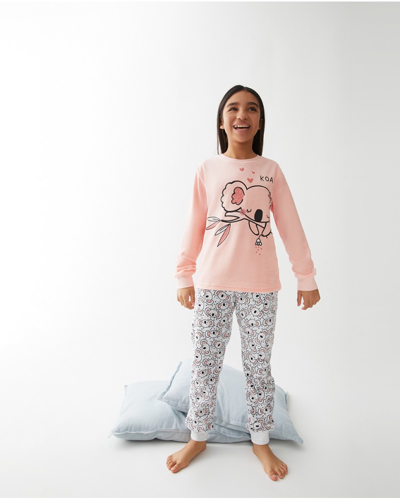 Pijama con dibujo en la camiseta y pantalón estampado. Con puños en mangas y piernas