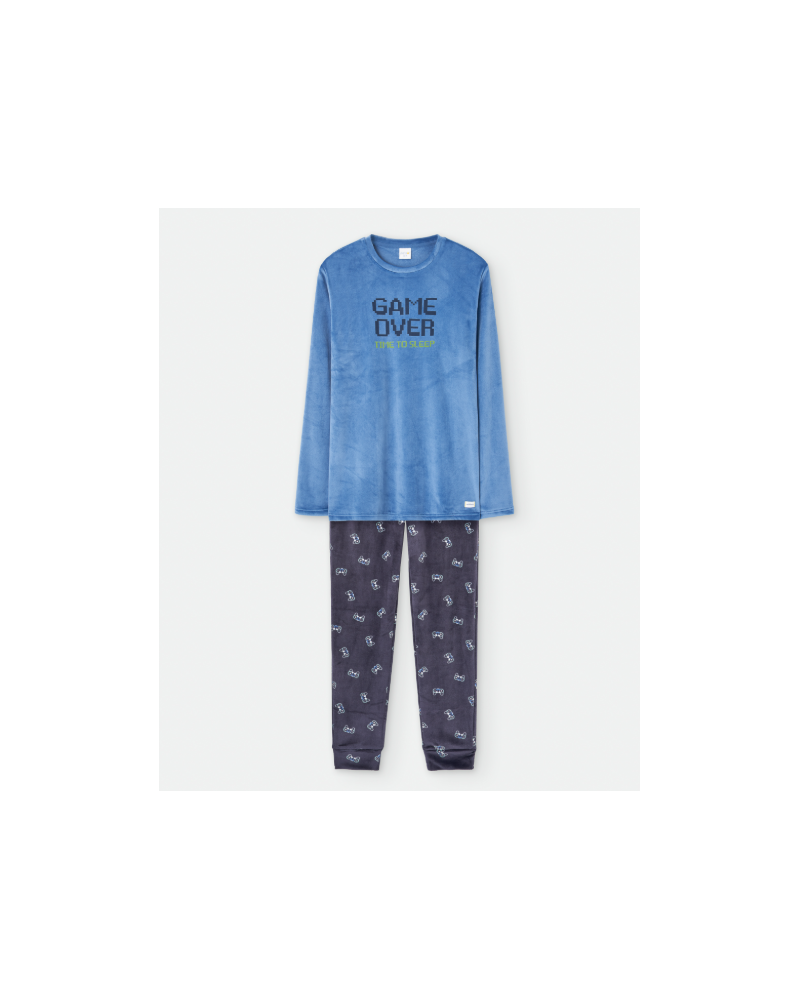 PIJAMA DOS PIEZAS DE TACTO SUAVE. CAMISETA CUELLO REDONDO Y MANGA LARGA. DELANTERO CON ESTAMPADO POSICIONAL DE LETTERING CON FONDO AZUL.