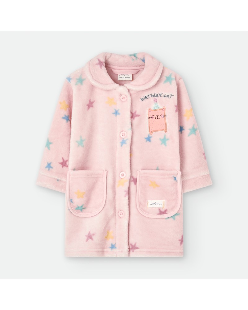 bata de coralina para bebe en color rosa con estampado de estrellitas. Con dos bolsillos en la parte delantera y abrochada con botones.