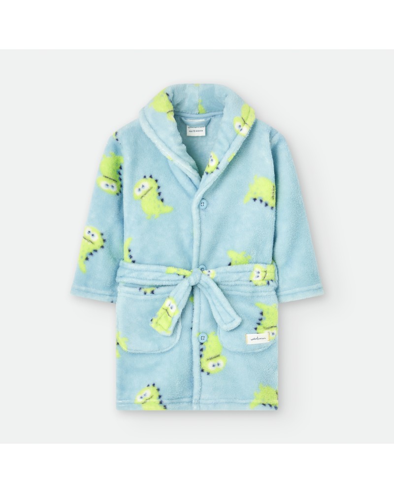 bata de coralina para bebe con estampado de dinos. Con dos bolsillos en la parte delantera y abrochada con botones.