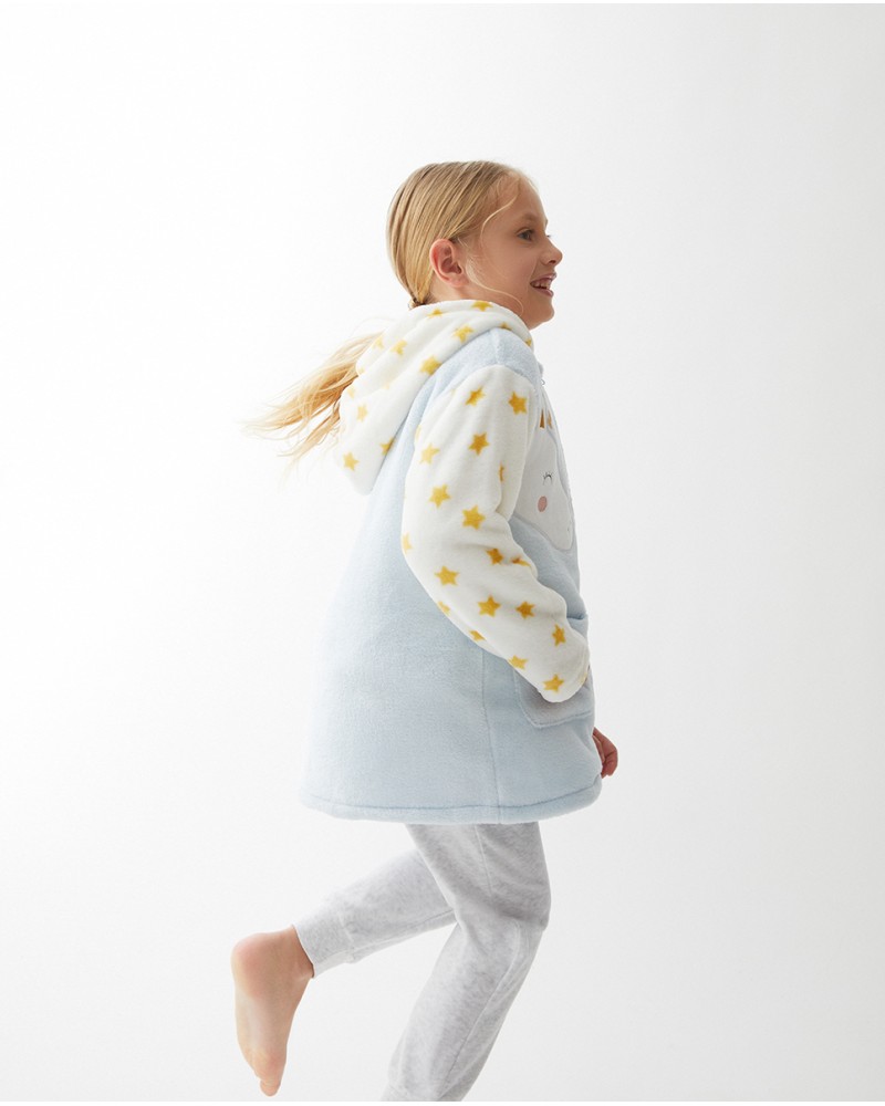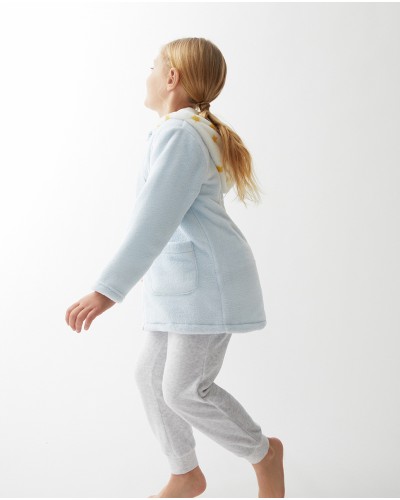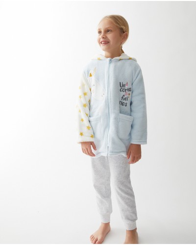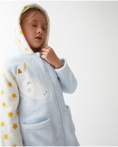 Bata de coralina con dibujo de unicornio en la parte delantera. Consta de dos bolsillos en la parte delantera y capucha, cierre de cremallera.