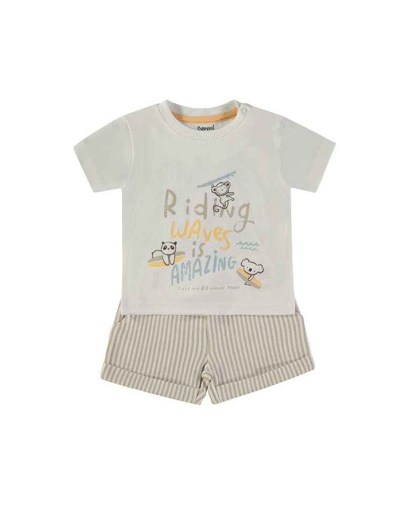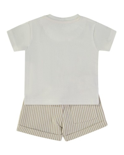 Conjunto de dos piezas para bebé con camiseta estampada y pantalón de rayas.