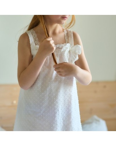 Camisón de plumetti para la Primera Comunión. Este camisón de niña está realizado en tejido de plumetti, con acabados de puntilla y un precioso lazo en la parte delantera.