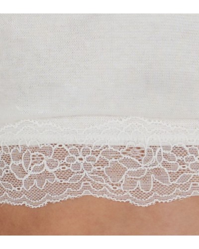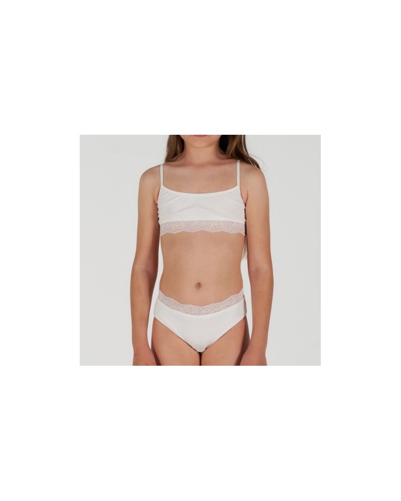 Conjunto de top y braguita de algodón con acabados con blonda. Este conjunto para niñas tiene un mínimo porcentaje de elastano para asegurar su adherencia y evitar deformaciones no deseadas.