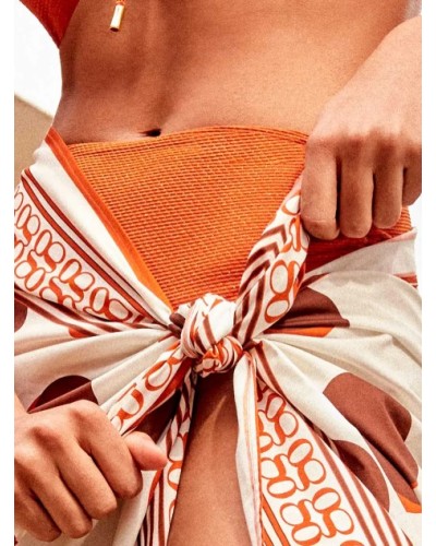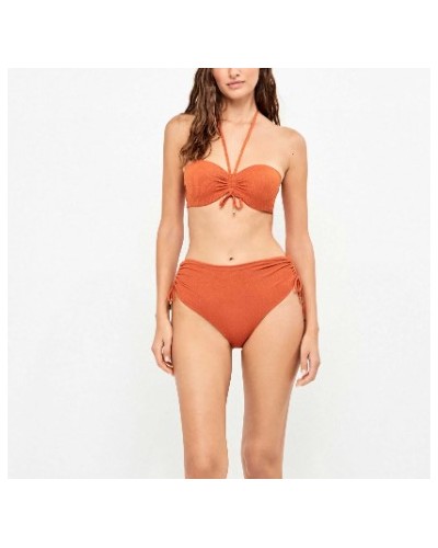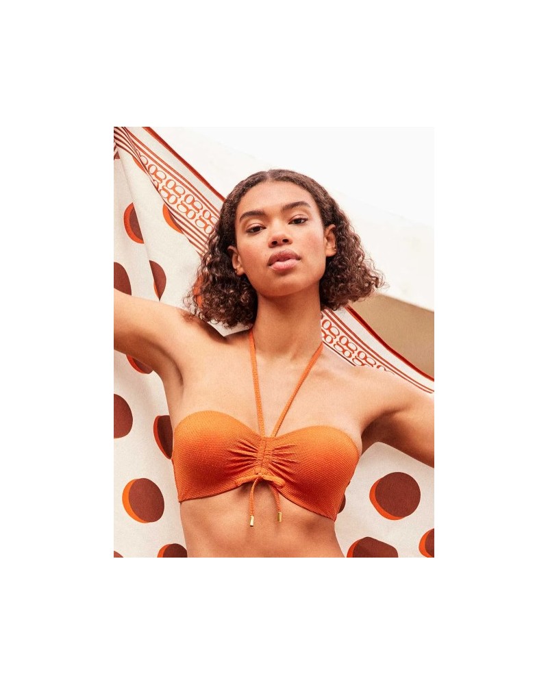 Top bikini bandeau desmontable, tirantes multiposición. Tejido piqué lurex dorado, con cierre especial con su braguita bikini a juego.