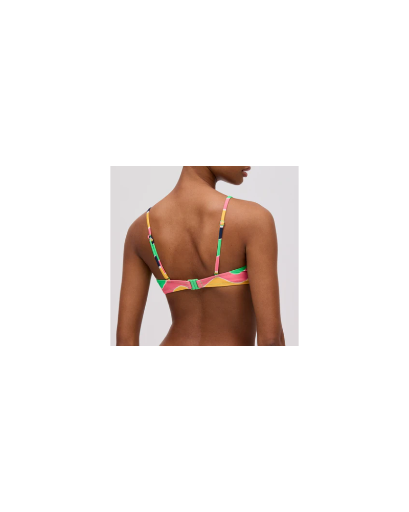 Top bikini triangular sin aro y con foam extraíble. Tirantes regulables, cierre trasero y detalle de nudo en el centro del escote.