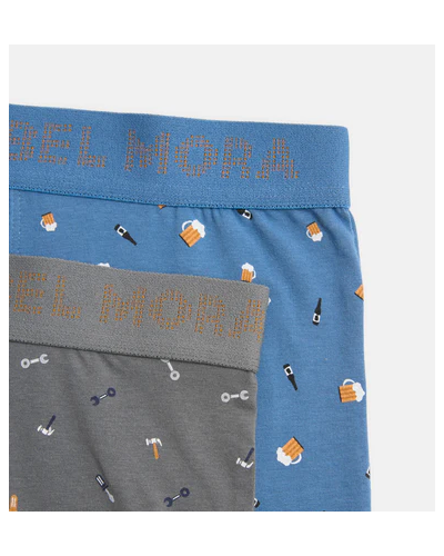 Pack de 2 bóxers estampados de Ysabel Mora confeccionados en algodón natural con un toque de elastano para mayor comodidad. Un modelo con estampado de herramientas y otro con motivos de bebidas. La cinturilla elástica con el logo de la marca aporta un acabado moderno y distintivo.