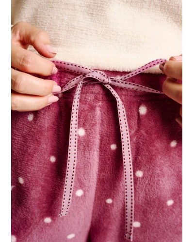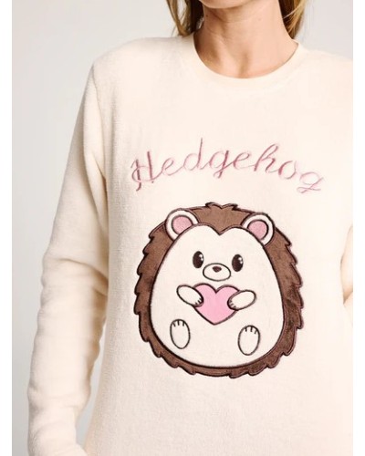 Este pijama de invierno combina la suavidad del tejido polar con un diseño entrañable. La parte superior, en color crema, destaca por el estampado frontal de un simpático erizo con corazón, mientras que el pantalón, en color burdeos, presenta un patrón de pequeños lunares blancos. Con puños en las mangas y tobillos, ofrece un ajuste cómodo que retiene el calor, ideal para las noches más frías.