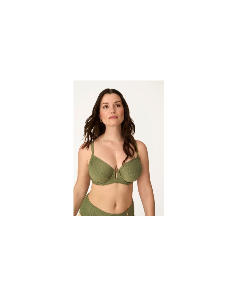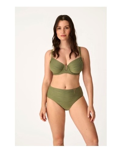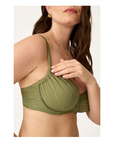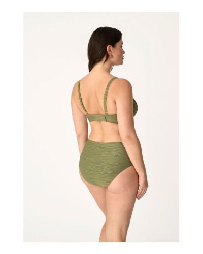 Bikini verde con pequeños toques de brillo, tiene un rizo en el pecho para mayor capacidad de agarre y una braguita alta.