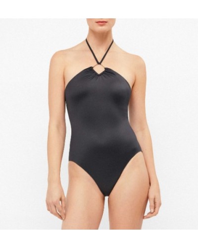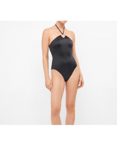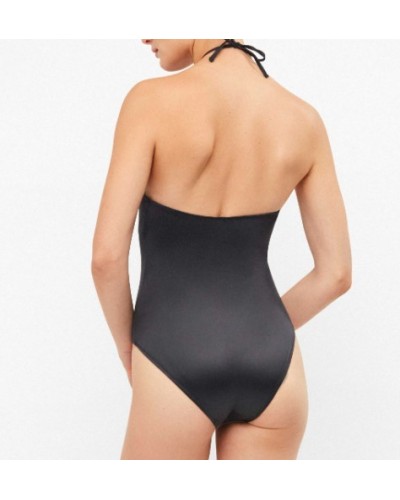 Bañador anudado al cuello, con copas extraíbles y espalda de corte bajo. En tejido de microfibra satinada, que le aporta frescura y luminosidad. La pieza dorada decorativa del escote, aporta un toque elegante a tus looks