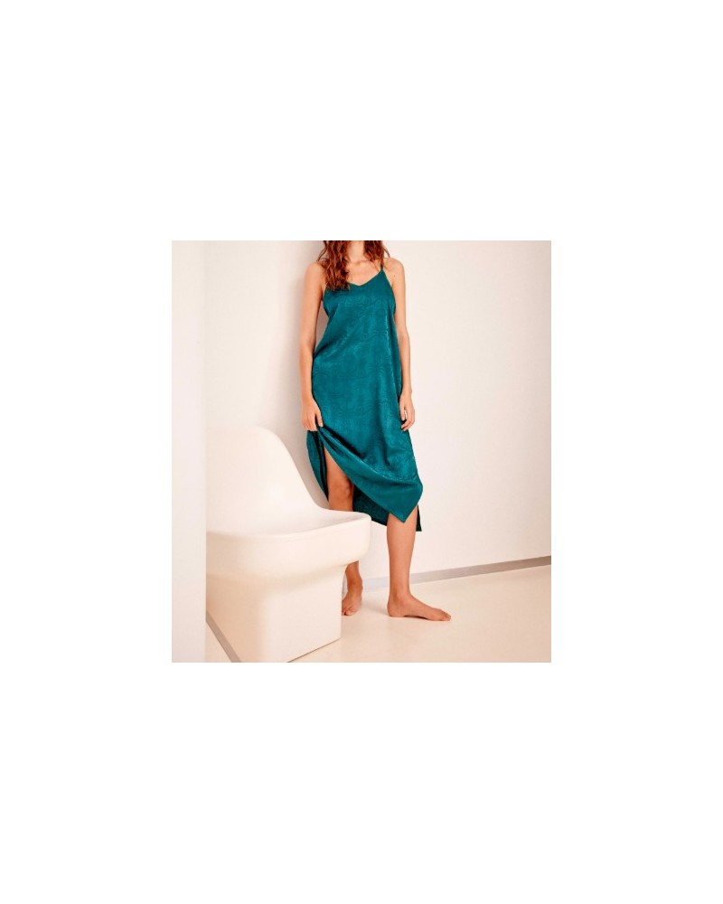 Camisón in and out en color verde botella, confeccionado en tejido jacquard de satén. Destaca por su fluidez y comodidad. Presenta tirantes finos regulables y apertura lateral. Ideal para ocasiones especiales.