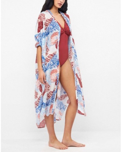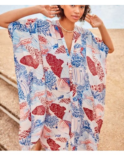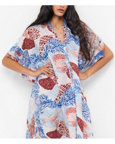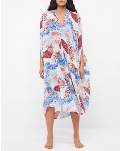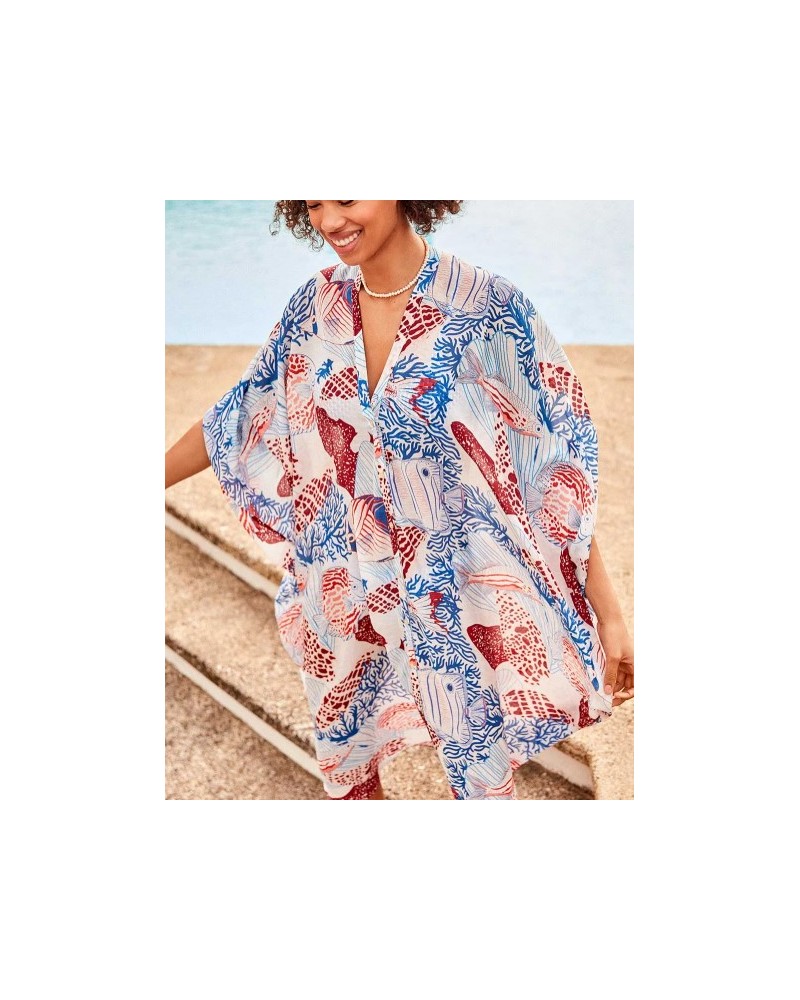 Caftán largo abotonado en la parte delantera.Tejido de gasa semitransparente de estampado inspiración marina. Fluído, ligero y vaporoso, perfecto para aportar movimiento y frescura al look.