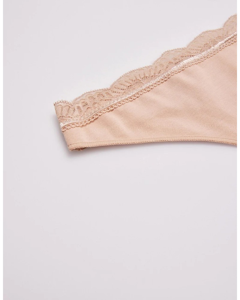 Tanga lencero en tejido Cotton Nature. Las fibras naturales de este material aportan un extra de suavidad a la prenda. Sus acabados con costuras planas invisibles evitan las marcas y favorecen una mayor adaptabilidad y un ajuste ergonómico perfecto. Modelo básico de gran confort pensado para el día a día. Decoradas con blonda. Confeccionadas con material antialergénico.