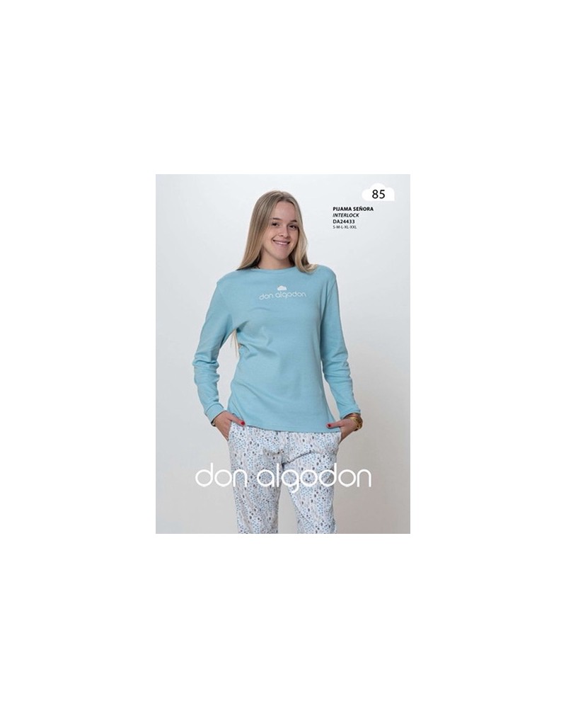 Pijama de mujer en algodón con cuello redondo , puños en mangas y pantalón.