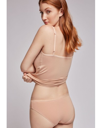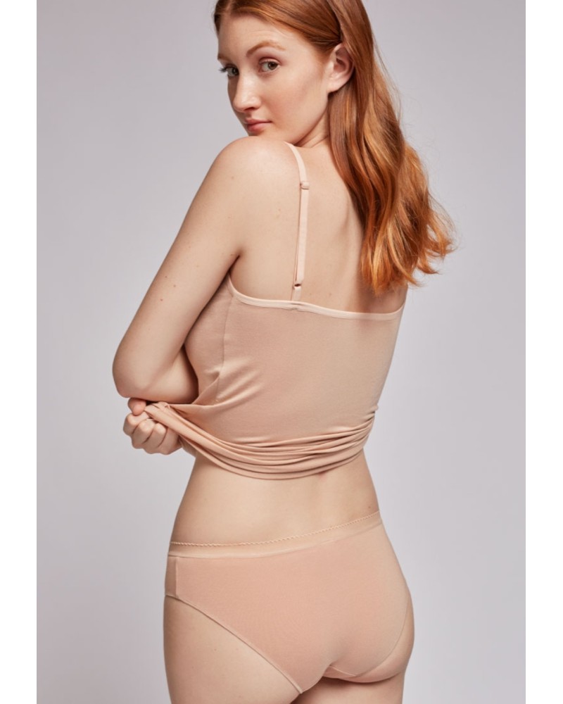 Camiseta interior de tirantes en tejido Eko Modal Lenzing. Material muy suave obtenido a partir de madera de haya proveniente de bosques de gestión sostenible con certificado FSC. Tirantes regulables y detalle de galón de encaje en el pecho.