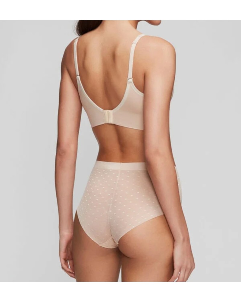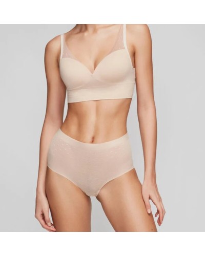 Braguita alta en plumeti invisible con corte laser en los bordes.