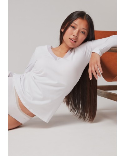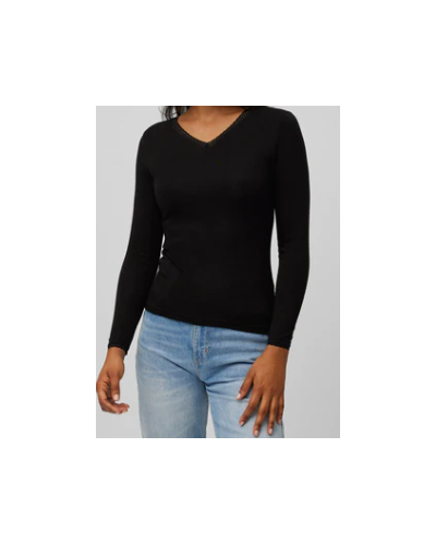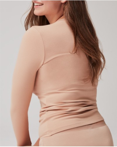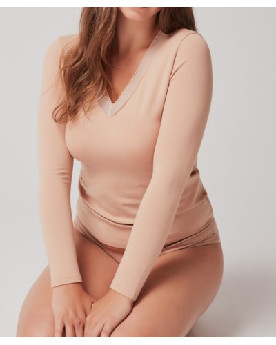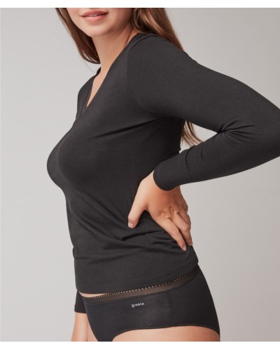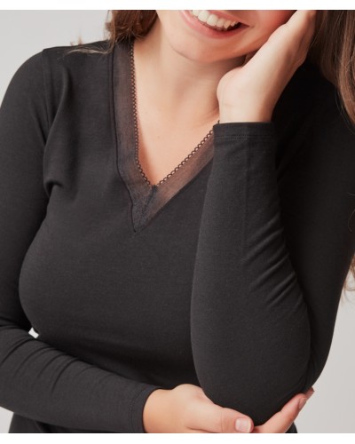 Camiseta interior termal de manga larga en tejido Eko Modal Lenzing, Material muy suave obtenido a partir de madera de haya proveniente de bosques de gestión sostenible. Esta camiseta termal mantiene el calor corporal y respetan la transpiración de la piel. Detalle de puntilla de encaje en escote.