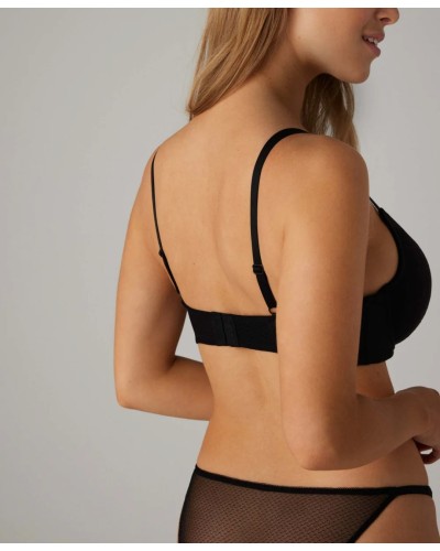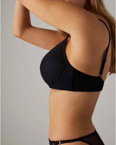 Sujetador con aro con relleno. Delicado y elegante diseño con encaje de lunares. Tirantes ajustables con cierres metálicos.