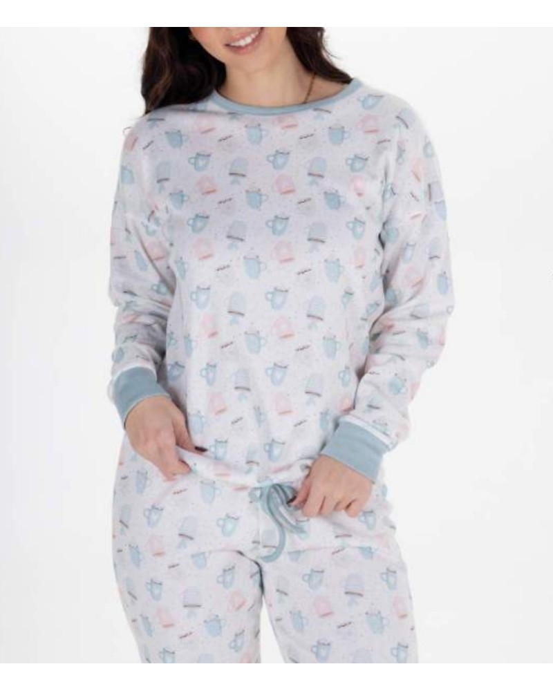 Pijamas señora de invierno con estampado de tazas y puños en magas y pies. Afelpado interior.