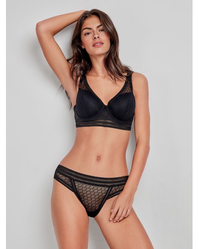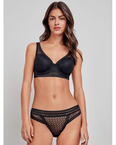 Conjunto de bralette de capacidad, con aro y foam, y un tejido de encaje a juego con su braguitas.