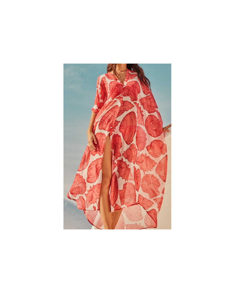 Caftán largo para ir a la playa en un tejido sedoso y un bonito estampado de corales