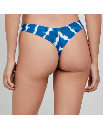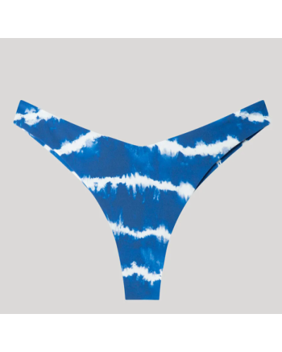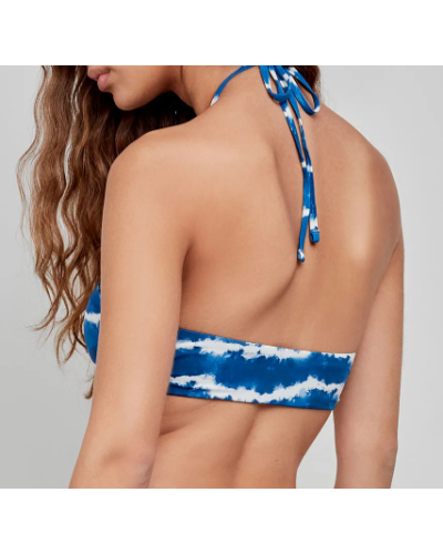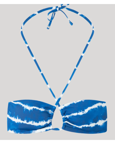 Top bikini bandeau sin aro y con foam extraíble en tejido estampado tie-dye. Tirantes multiposición y pieza en el centro que estiliza la zona. Braguita bikini brasileña corte en V en tejido estampado tie-dye.