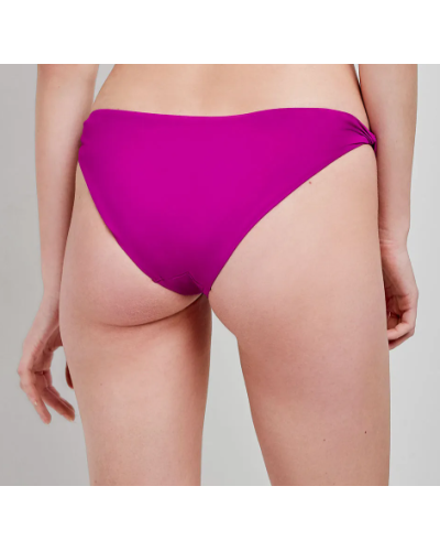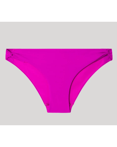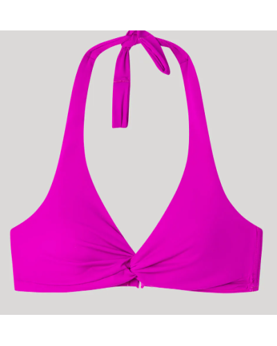 Top bikini triangular sin aro y con foam extraíble. Tirantes regulables, cierre trasero y detalle de nudo en el centro del escote.