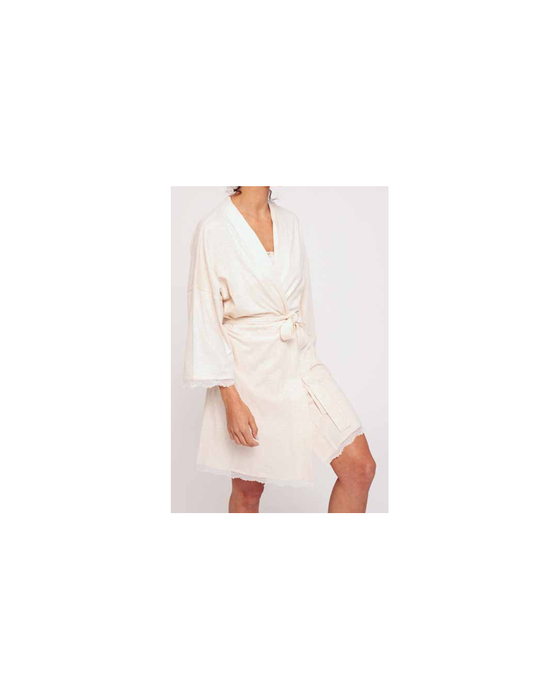 Bata cruzada en tono crema con cinturón para un mayor ajuste y detalle de puntilla en la parte de abajo.