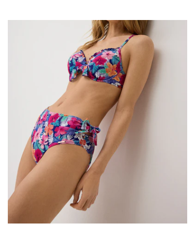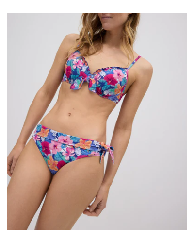 Bikini en copa C con sujetador en corte clasico, con aro y relleno. Braguita con detalle de lazo en el lateral