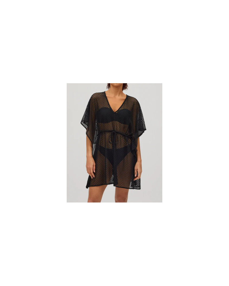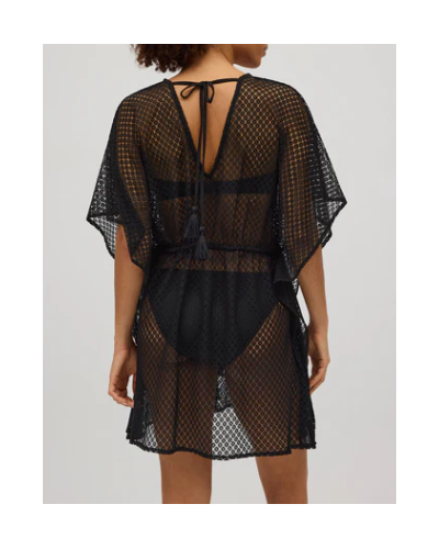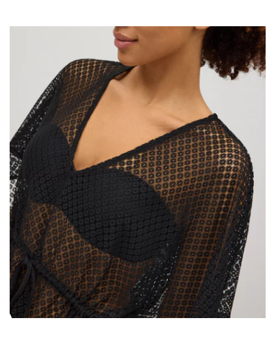 Kaftán de tejido calado con anudado en el cuello. Perfecto para días de calor aportando un toque sexy al look. El cuello en V le da un toque de elegancia. Cintura ajustada mediante un nudo para poder adaptártela a tu gusto.